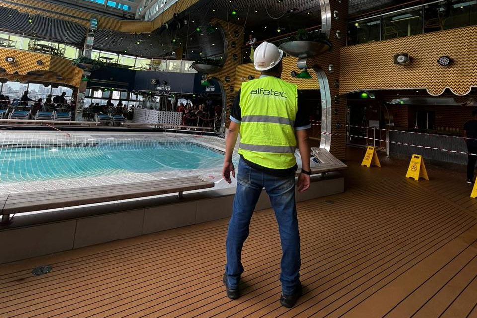 Cruise ship repairs on pool roof protections
